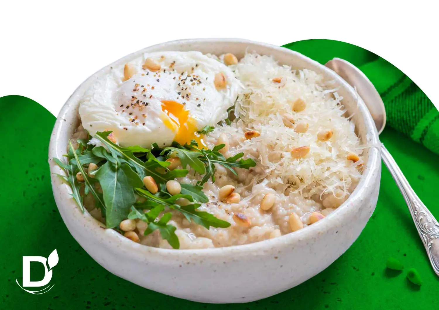 - Сервируйте блюдо. В тарелку выложите овсянку, на нее — очищенное яйцо, сверху посыпьте кашу орешками и измельченным зеленым луком.