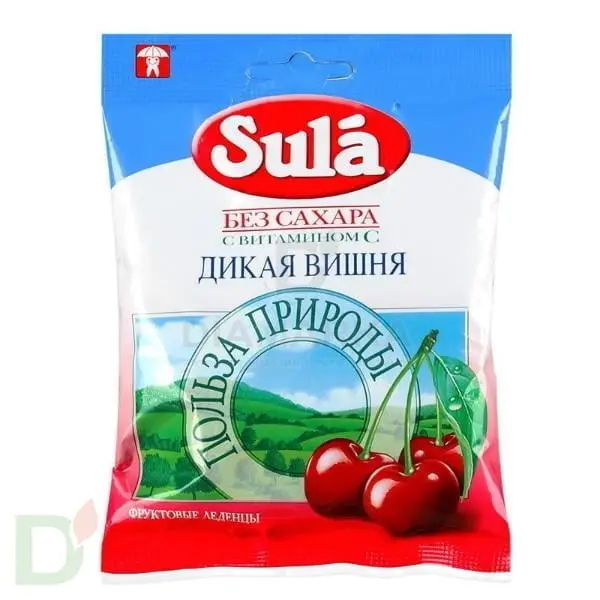 <p> Леденцы Зула без сахара с витамином С "Дикая вишня", 60г. </p> <p> Леденцы Зула являются абсолютно натуральным продуктом, изготовленным из сорбита, витаминов и натуральных соков. </p> <p> Уникальная рецептура придает<br> леденцам настоящий фруктовый вкус. </p> <p> Состав: сорбит, загуститель(гуммиарабик), подкислители: лимонная<br> кислота, молочная кислота, аскорбиновая кислота, витамин С, концентрат<br> вишневого сока, натуральный краситель - карминовая кислота, натуральные<br> ароматизаторы - вишня. </p> <p> Пищевая ценность: белки 0г; углеводы 93,3г; жиры 0г; Витамин С 292 мг. </p> <p> Энергетическая ценность: 231 ккал.<br> 7-8 конфет удовлетворяют дневную потребность в витамине С. </p> <p> Разрешено для употребления диабетикам. </p> <p> Срок хранения: 2года.<br> Хранить при Т от +15'C до +21'С, и относительной влажности воздуха не<br> более 75%. </p>